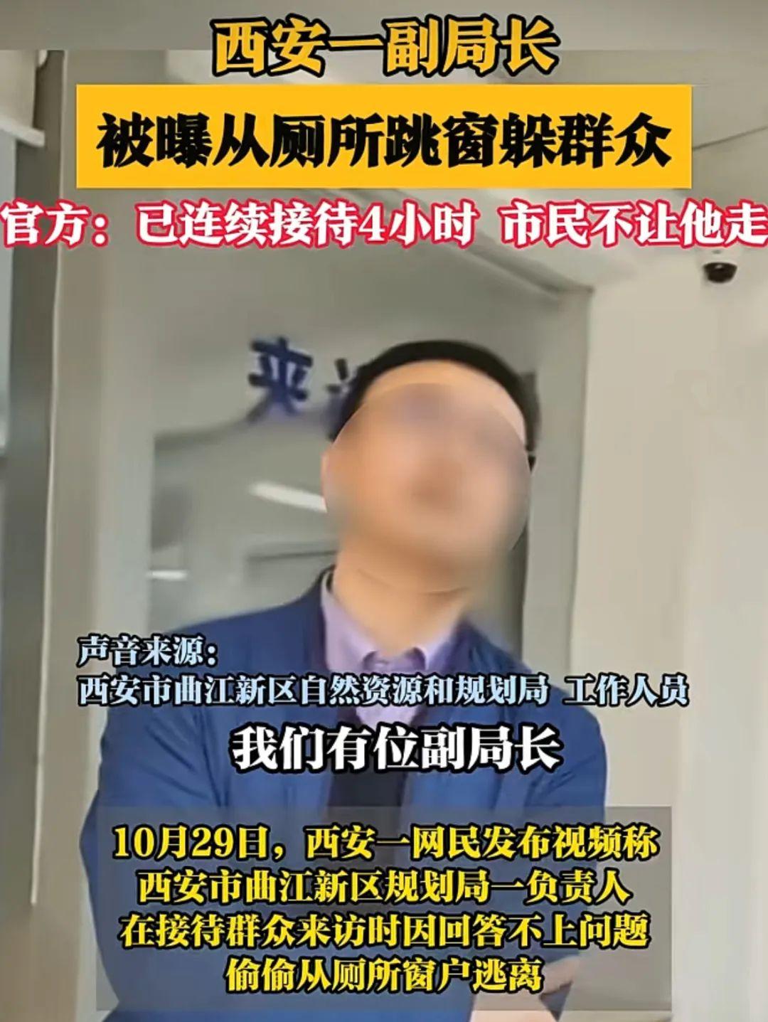 10月28日,一則“官員跳窗逃跑”的視頻在網(wǎng)絡(luò)傳播。視頻顯示,多名群眾將一名身著藍(lán)色上衣的男子圍住,疑似就房屋拆遷問題進(jìn)行爭執(zhí)。圍觀群眾有的拍桌子,有的大聲呼喊,稱“今天不給個說法,誰也別想離開這里”等,隨后該男子從廁所跳窗逃走。10月29日,大皖新聞、《瀟湘晨報》等多家媒體報道此事。據(jù)爆料的西安市民反映,其上訪是因為自己家附近正在拆遷,當(dāng)?shù)鼐用癜l(fā)現(xiàn)政府部門最新規(guī)劃的地理位置與最初承諾的不一樣,且距離高壓線過近。當(dāng)日下午,西安市曲江新區(qū)自然資源和規(guī)劃局工作人員通過媒體回應(yīng)稱,視頻人物是該局一名副局長,其從九點多到下午一點多一直在接訪,但市民不讓其離開,無奈之下從窗戶離開。針對群眾反映的情況,該局也在研究高壓線設(shè)備的遷移問題,后續(xù)將進(jìn)一步加強(qiáng)與征遷市民的溝通交流,爭取妥善處理。10月30日下午,“@封面新聞”報道稱,針對工作人員在接訪期間的不當(dāng)行為,曲江新區(qū)黨工委、管委會高度重視,已安排紀(jì)檢監(jiān)察機(jī)關(guān)聯(lián)合相關(guān)部門啟動調(diào)查程序。當(dāng)?shù)毓俜降目焖偬幹糜行Ь徍洼浨?,但事件帶來的討論為公職人員和政府部門應(yīng)對網(wǎng)絡(luò)輿情提供思路和借鑒。