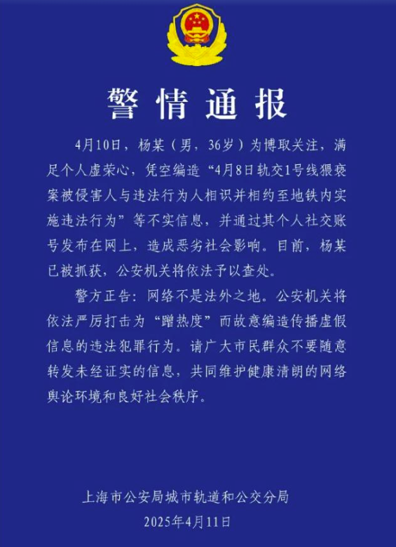 4月11日9時(shí)29分,“@軌交幺幺零”再發(fā)通報(bào)稱,男子楊某為博取關(guān)注,憑空編造“軌交1號線猥褻案男女雙方相識”謠言,發(fā)布到網(wǎng)上后造成惡劣影響,目前已被抓獲。官方通報(bào)再掀一波討論熱潮,微博轉(zhuǎn)評2萬余次、點(diǎn)贊超26萬次,“進(jìn)去得好”“還是官方速度快”等評論獲得網(wǎng)民點(diǎn)贊認(rèn)同。紅星新聞、極目新聞等媒體發(fā)文稱,“造黃謠和性騷擾都該人人喊打”;部分網(wǎng)民言論涉及性別對立話題,如“出手相助的是女的,猥褻造謠的都是男的”。截至4月17日12時(shí),該事件相關(guān)輿情信息量超8萬條,“#上海地鐵一男子疑脫褲猥褻女乘客#”“#上海辟謠地鐵猥褻事件當(dāng)事人相識#”等數(shù)十個(gè)關(guān)聯(lián)微話題累計(jì)閱讀量超6億。