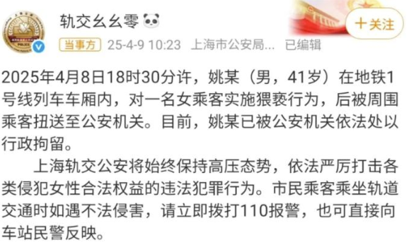 4月9日上午,多段網(wǎng)傳視頻引發(fā)關(guān)注,視頻顯示,上海地鐵一名女乘客疑似被猥褻,對身邊男子哭喊道“你把褲子脫了并弄到我身上”,同車女子稱“姐妹,我錄了視頻,我陪你去”?!癅荔枝新聞”等媒體跟進(jìn)報(bào)道,上海地鐵客服工作人員稱確有其事,網(wǎng)民痛斥男子“變態(tài)”“垃圾”。當(dāng)日10時(shí)23分,上海市公安局城市軌道和公交分局官微“@軌交幺幺零”發(fā)通報(bào)稱,“4月8日18時(shí)30分許,姚某在地鐵1號線列車車廂內(nèi),對一名女乘客實(shí)施猥褻行為,被周圍乘客扭送至公安機(jī)關(guān)。目前,姚某已被公安機(jī)關(guān)依法處以行政拘留”。多數(shù)網(wǎng)民稱贊警方行動(dòng)快速;部分網(wǎng)民表示不滿,認(rèn)為行政拘留處罰較輕。4月10日,男子所在的工作單位發(fā)布公告,宣布將其開除。