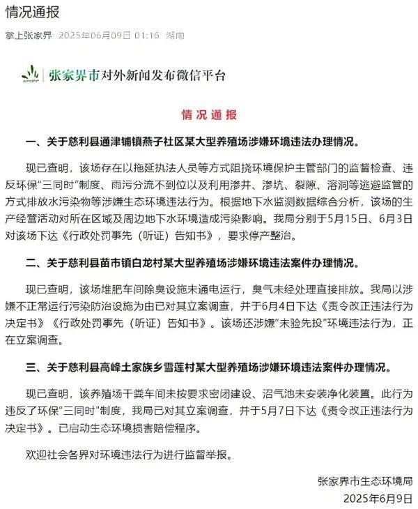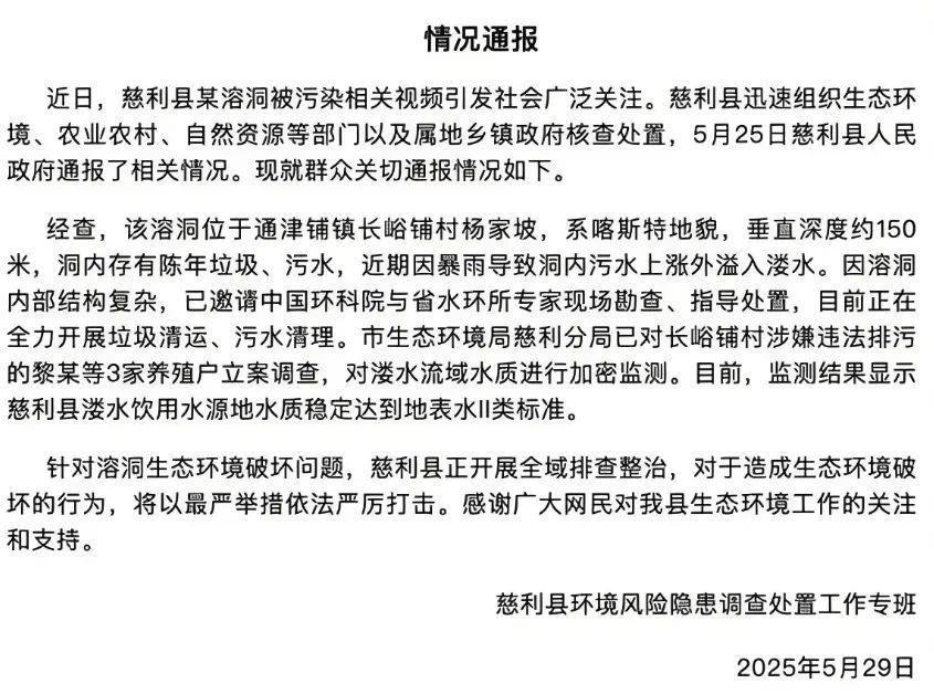 5月22日,“慈利發(fā)布”發(fā)文稱,近期發(fā)現(xiàn)長(zhǎng)潭河電站大壩上游出現(xiàn)大面積渾濁污水,初步排查是從楊家坡溶洞溢流至溇水所致,執(zhí)法人員正在排查周邊區(qū)域環(huán)境違法行為。5月25日,“慈利發(fā)布”通報(bào)工作進(jìn)展,稱已經(jīng)對(duì)多家養(yǎng)殖場(chǎng)指導(dǎo)立行立改,同時(shí)對(duì)涉嫌失職瀆職的相關(guān)責(zé)任人員同步啟動(dòng)責(zé)任倒查。5月28日,張家界市生態(tài)環(huán)境局工作人員向媒體表示,他們很早就接到了對(duì)溶洞排污事件的投訴,從4月中旬開始一直在進(jìn)行調(diào)查處理,最新調(diào)查進(jìn)展將及時(shí)通報(bào)。5月29日,慈利縣再次發(fā)布情況通報(bào)稱,當(dāng)?shù)厣鷳B(tài)環(huán)境局已對(duì)涉嫌違法排污的3家養(yǎng)殖戶立案調(diào)查。經(jīng)水質(zhì)監(jiān)測(cè),慈利縣溇水飲用水源地水質(zhì)穩(wěn)定達(dá)到地表水Ⅱ類標(biāo)準(zhǔn)。