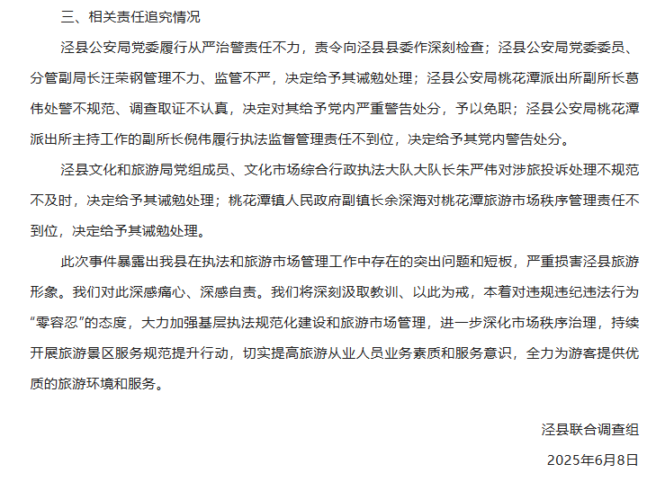 6月7日0時(shí)許,涇縣文化和旅游局發(fā)布情況通報(bào)稱,已成立工作專班進(jìn)行全面調(diào)查,向游客蔡某及其家人致歉。但輿論怒火并未完全平息,不少網(wǎng)民表示不能僅讓文旅部門“背鍋”,當(dāng)?shù)毓矙C(jī)關(guān)應(yīng)深入調(diào)查、嚴(yán)肅問責(zé)。據(jù)微信公眾號(hào)“涇縣人民政府發(fā)布”7日晚消息,涇縣召開全縣旅游市場(chǎng)秩序整治工作會(huì)議,會(huì)議要求“聚焦短板弱項(xiàng),抓好旅游市場(chǎng)秩序整治”等。