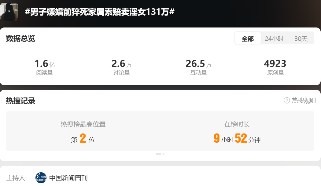 此案被報(bào)道后,“@中國(guó)新聞周刊”、上觀新聞、封面新聞等媒體接力傳播,推高輿情熱度,微博話題“#男子嫖娼前猝死家屬索賠賣淫女131萬(wàn)#”登上熱搜榜第2位。