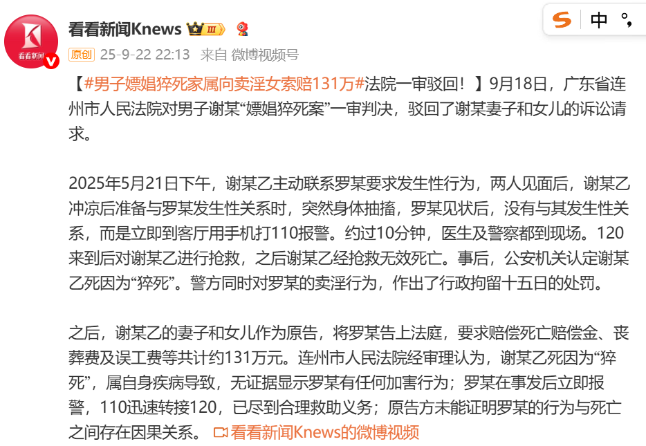 9月22日,據(jù)上海電視臺(tái)“@看看新聞Knews”消息,9月18日,廣東省連州市人民法院對(duì)男子謝某“嫖娼猝死案”作出一審判決。裁判文書(shū)網(wǎng)顯示,5月21日,謝某主動(dòng)聯(lián)系羅某要求發(fā)生性行為,兩人見(jiàn)面后,謝某沖涼后準(zhǔn)備發(fā)生性關(guān)系時(shí)突然身體抽搐,羅某見(jiàn)狀后,立即到客廳撥打110報(bào)警。醫(yī)護(hù)人員趕到后對(duì)謝某進(jìn)行搶救,謝某經(jīng)搶救無(wú)效死亡。警方認(rèn)定謝某死因?yàn)椤扳馈?,?duì)羅某的賣淫行為,作出行政拘留十五日的處罰。事后,謝某的妻子和女兒將羅某告上法庭,要求賠償死亡賠償金、喪葬費(fèi)及誤工費(fèi)等共計(jì)約131萬(wàn)元。連州市人民法院經(jīng)審理認(rèn)為,謝某死因?yàn)椤扳馈?,屬自身疾病?dǎo)致,無(wú)證據(jù)顯示羅某有任何加害行為;羅某在事發(fā)后當(dāng)即報(bào)警并配合120搶救,已盡到合理救助義務(wù);原告方未能證明羅某的行為與死亡之間存在因果關(guān)系。據(jù)此,該法院駁回謝某妻子和女兒的全部訴訟請(qǐng)求。