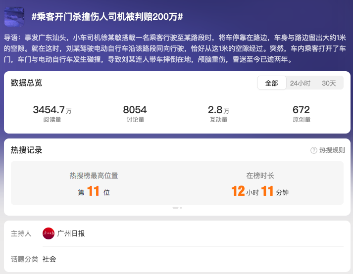 此案被報(bào)道后,環(huán)球網(wǎng)、上觀新聞、《廣州日?qǐng)?bào)》等媒體接力傳播,推高輿情熱度,微博話(huà)題“#乘客開(kāi)門(mén)殺撞傷人司機(jī)被判賠200萬(wàn)#”登上熱搜榜第11位。