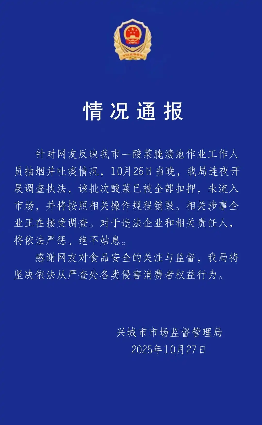 10月27日,遼寧省興城市市場(chǎng)監(jiān)督管理局通過(guò)微信公眾號(hào)“興城市市場(chǎng)監(jiān)督管理局”發(fā)布情況通報(bào)稱,針對(duì)網(wǎng)友反映的情況,10月26日當(dāng)晚,該局連夜開(kāi)展調(diào)查執(zhí)法,該批次酸菜已被全部扣押,未流入市場(chǎng),并將按照相關(guān)操作規(guī)程銷(xiāo)毀。涉事企業(yè)正在接受調(diào)查。對(duì)于違法企業(yè)和相關(guān)責(zé)任人,將依法嚴(yán)懲、絕不姑息。隨后,中國(guó)新聞網(wǎng)、光明網(wǎng)、觀察者網(wǎng)等媒體轉(zhuǎn)發(fā)報(bào)道。