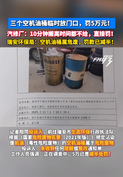 11月4日,據(jù)溫州市新聞傳媒中心《溫州晚間報(bào)道》欄目報(bào)道,溫州瑞安一汽修店負(fù)責(zé)人彭先生求助稱(chēng),近日因廠里地面做地坪漆,臨時(shí)將三個(gè)空機(jī)油桶挪到門(mén)口,11月1日瑞安市生態(tài)環(huán)保行政執(zhí)法隊(duì)到店檢查,當(dāng)場(chǎng)對(duì)此定性為“隨意擺放危險(xiǎn)廢物”,直接通知要對(duì)該違法行為處罰5萬(wàn)元,執(zhí)法人員稱(chēng)“簽字認(rèn)罰5萬(wàn)、不簽字則罰10萬(wàn)”。彭先生認(rèn)為處罰過(guò)重,無(wú)法接受。