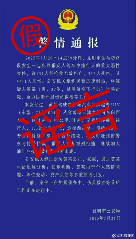 7月20日中午時(shí)分,多名網(wǎng)民發(fā)布視頻稱,云南省昆明市金馬碧雞坊附近發(fā)生一起交通肇事逃逸案件。7月21日上午,一份落款為“昆明市公安局”的“警情通報(bào)”在網(wǎng)絡(luò)流傳,稱“該重大惡性案件致131人死亡,337人受傷,公安機(jī)關(guān)已將嫌疑人黃某當(dāng)場擊斃。初步判斷,黃某由于個(gè)人感情問題、職位變動、資產(chǎn)負(fù)債等多重原因駕車撞人”。通報(bào)中傷亡人數(shù)巨大引發(fā)網(wǎng)民震驚和追問,但也有部分網(wǎng)民質(zhì)疑通報(bào)真實(shí)性,認(rèn)為該通報(bào)格式、內(nèi)容、邏輯等均有問題。7月21日中午,昆明市交管支隊(duì)發(fā)布警情通報(bào)稱,該事件系交通肇事逃逸,事故共造成2人死亡,9人受傷。肇事者李某某已被抓獲,已排除酒駕、毒駕嫌疑。7月23日,昆明市公安局五華分局通報(bào)稱,白某某、陳某某為博取關(guān)注、吸引眼球,傳播虛假“警情通報(bào)”,已被刑事拘留。8月1日,公安部網(wǎng)安局微信公眾號將此案作為“凈網(wǎng)——2025”專項(xiàng)行動的典型案例予以發(fā)布。