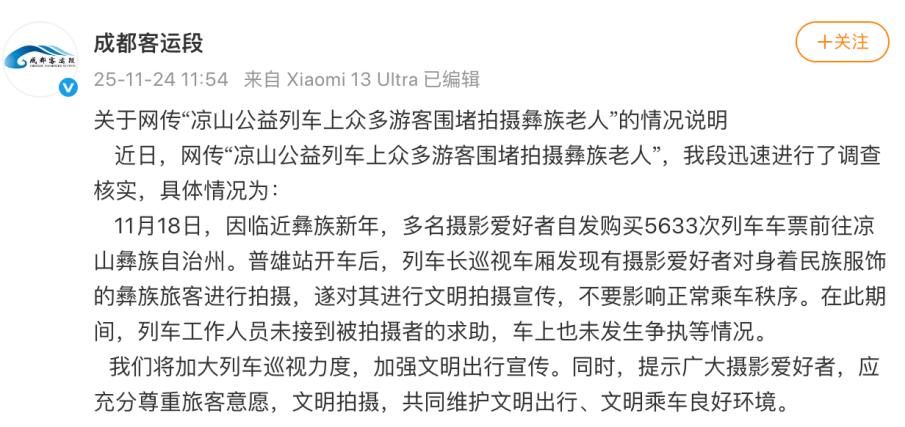 11月24日12時(shí)許,“@成都客運(yùn)段”發(fā)布情況說明稱,因臨近彝族新年,近日多名攝影愛好者乘坐5633次列車前往涼山彝族自治州。普雄站開車后,列車長巡視車廂發(fā)現(xiàn)有攝影愛好者對身著民族服飾的彝族旅客進(jìn)行拍攝,遂對其進(jìn)行文明拍攝宣傳,不要影響正常乘車秩序。在此期間,列車工作人員未接到被拍攝者的求助,車上也未發(fā)生爭執(zhí)等情況。今后將加大列車巡視力度,加強(qiáng)文明出行宣傳。