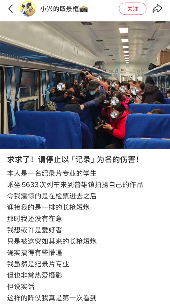 11月19日20時(shí)許,小紅書網(wǎng)民“@小興的取景框”發(fā)帖稱,自己在乘坐5633次列車前往普雄鎮(zhèn)的途中,在車廂內(nèi)遇到一攝影團(tuán)手持“長槍短炮”不停走動,并不顧被拍攝者意愿圍著一個人拍攝,呼吁停止以“記錄”為名的傷害,不少網(wǎng)民留言認(rèn)為這是冒犯被拍攝者的“鏡頭霸凌”行為。
