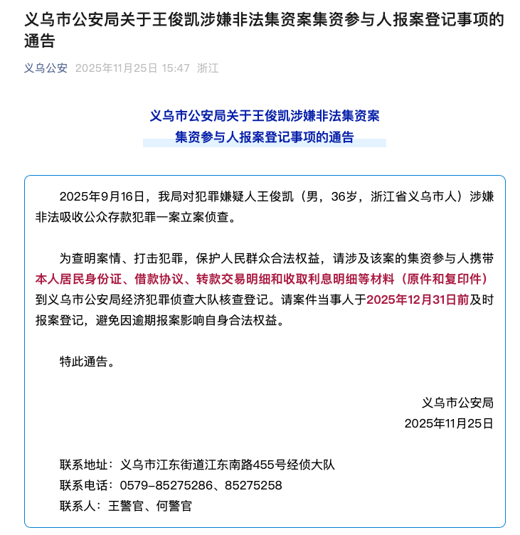 11月25日,義烏市公安局發(fā)布通告:2025年9月16日,我局對犯罪嫌疑人王俊凱(男,36歲,浙江省義烏市人)涉嫌非法吸收公眾存款犯罪一案立案偵查。為查明案情、打擊犯罪,保護人民群眾合法權(quán)益,請涉及該案的集資參與人攜帶本人居民身份證、借款協(xié)議、轉(zhuǎn)款交易明細和收取利息明細等材料(原件和復印件)到義烏市公安局經(jīng)濟犯罪偵查大隊核查登記。請案件當事人于2025年12月31日前及時報案登記,避免因逾期報案影響自身合法權(quán)益。