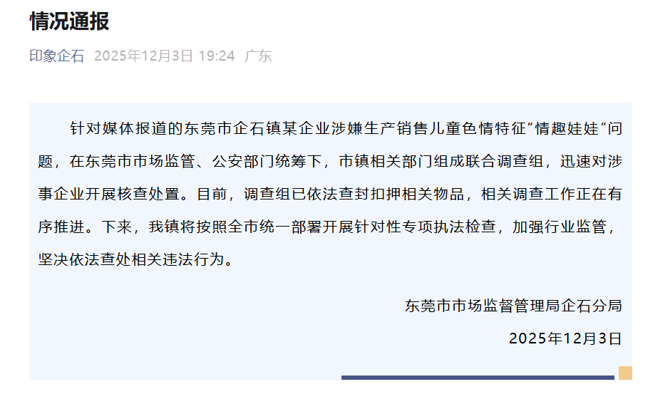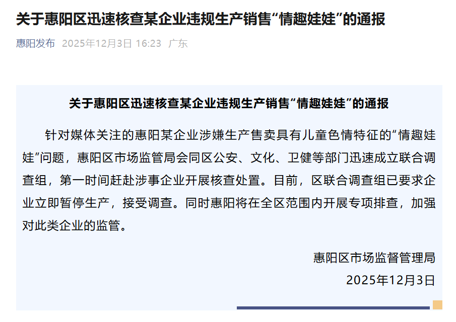 12月3日上午,廣東惠州惠陽區(qū)市場監(jiān)督管理局一名工作人員表示,針對報(bào)道披露的事件,惠陽區(qū)相關(guān)領(lǐng)導(dǎo)高度重視,已召集多部門進(jìn)行聯(lián)合研判。3日下午,惠陽區(qū)市場監(jiān)督管理局發(fā)布情況通報(bào),已會同區(qū)公安、文化、衛(wèi)健等部門迅速成立聯(lián)合調(diào)查組,要求企業(yè)立即暫停生產(chǎn),接受調(diào)查,同時(shí)將在全區(qū)范圍內(nèi)開展專項(xiàng)排查。3日下午,上海市奉賢區(qū)市場監(jiān)督管理局一名工作人員表示,針對此事,正在調(diào)查中。3日晚間,東莞市市場監(jiān)督管理局企石分局通報(bào)稱,在東莞市市場監(jiān)管、公安部門統(tǒng)籌下,市鎮(zhèn)相關(guān)部門組成聯(lián)合調(diào)查組,目前已依法查封扣押相關(guān)物品,接下來將按照全市統(tǒng)一部署開展針對性專項(xiàng)執(zhí)法檢查。