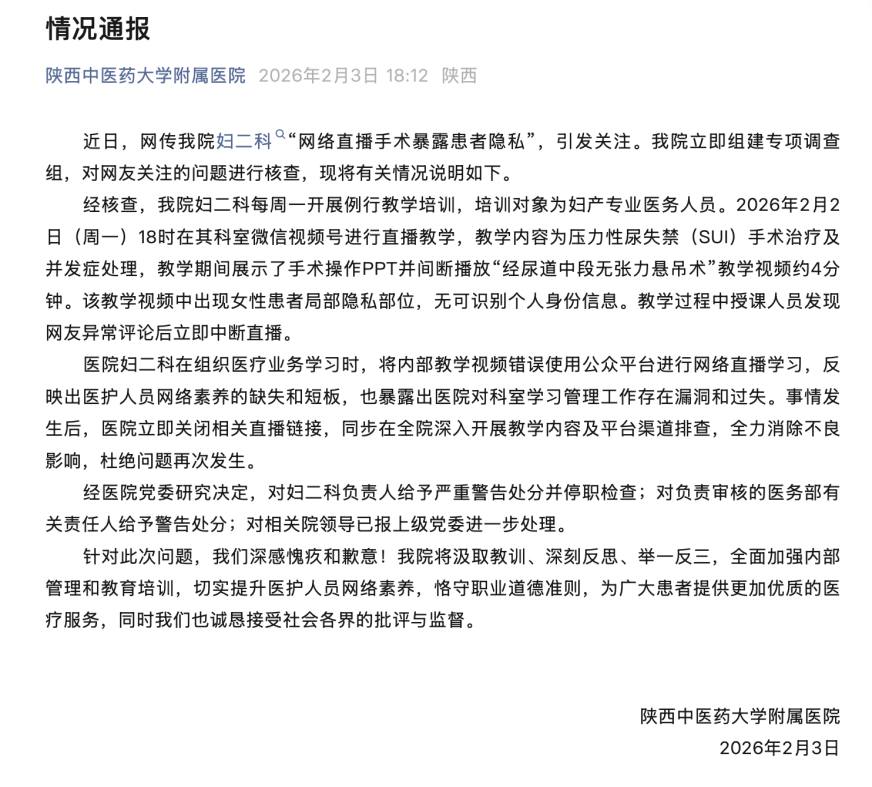 我院婦二科每周一開展例行教學(xué)培訓(xùn),培訓(xùn)對象為婦產(chǎn)專業(yè)醫(yī)務(wù)人員。2月2日18時其科室微信視頻號進行直播教學(xué),視頻中出現(xiàn)女性患者局部隱私部位,無可識別個人身份信息。教學(xué)過程中授課人員發(fā)現(xiàn)網(wǎng)民異常評論后立即中斷直播。科室將內(nèi)部教學(xué)視頻用于公眾平臺直播,暴露醫(yī)護人員網(wǎng)絡(luò)素養(yǎng)不足及醫(yī)院管理漏洞。醫(yī)院已關(guān)閉直播鏈接、開展全院排查,并對婦二科負責(zé)人給予嚴(yán)重警告及停職檢查處分,對醫(yī)務(wù)部相關(guān)責(zé)任人給予警告處分,相關(guān)院領(lǐng)導(dǎo)已報上級黨委處理。醫(yī)院對此深表愧疚歉意,承諾將汲取教訓(xùn)、加強管理,提升醫(yī)護人員素養(yǎng),誠懇接受社會監(jiān)督。