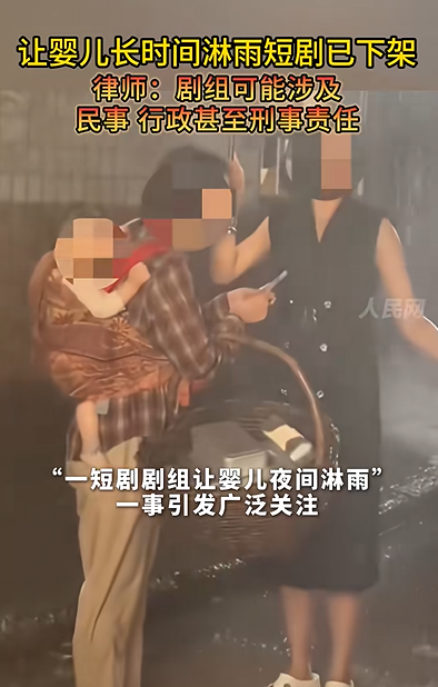 1月17日,短劇女演員邢昀發(fā)文吐槽“短劇劇組讓嬰兒夜間淋雨半小時”,帖文中稱,“夜里拍雨戲特別冷,灑水車那種瓢潑大雨,打傘也難以遮住,孩子被淋了好久,哭得撕心裂肺!”她還透露,拍近景時演員臉上不能有雨,所以傘不能放低,最好的解決辦法是拍主角鏡頭時把孩子換成假孩子,但是劇組為了節(jié)約時間就沒有換。隨后“#嬰兒淋雨拍短劇#”話題登上熱搜榜第2位。據(jù)九派新聞、紅星新聞等媒體跟進報道,該場戲嬰兒的片酬僅800元,部分家長因經(jīng)濟壓力接受此類拍攝。目前該微短劇已全平臺下架。