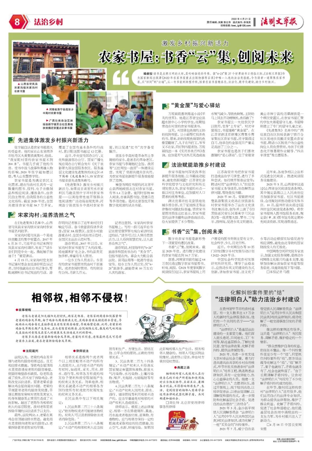 讀書是點(diǎn)燃文明的火炬,是吹響奮進(jìn)的號角。值“4·23”第27個世界讀書日將臨之際,《法制文萃報》作為國家新聞出版署《2022年農(nóng)家書屋重點(diǎn)出版物推薦目錄》中唯一入選的法治類報紙,今與讀者一道聚焦農(nóng)家書屋,從“田間”到“云端”,從一專多能到轉(zhuǎn)型升級,探索農(nóng)家書屋精品化、法治化、數(shù)字化建設(shè),助力鄉(xiāng)村振興。