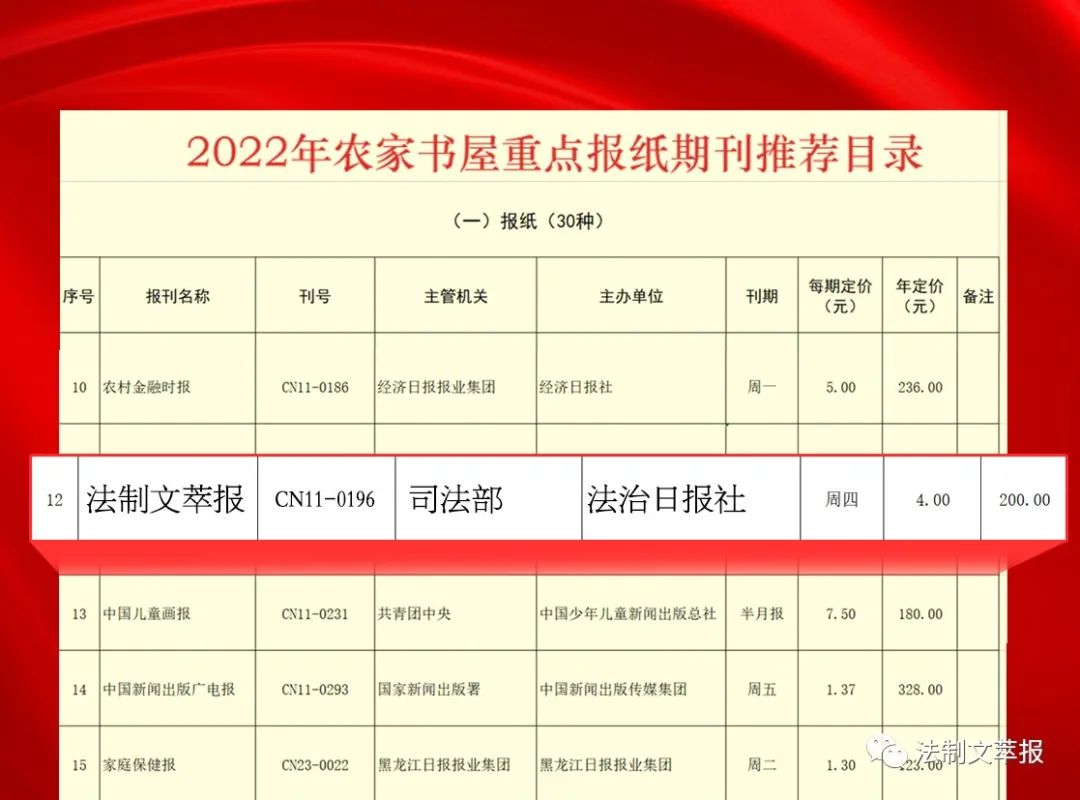 為深入學(xué)習(xí)宣傳貫徹習(xí)近平新時(shí)代中國特色社會(huì)主義思想,迎接黨的二十大勝利召開,指導(dǎo)各地做好2022年農(nóng)家書屋出版物補(bǔ)充更新工作,國家新聞出版署組織制定了《2022年農(nóng)家書屋重點(diǎn)出版物推薦目錄》?!锻扑]目錄》分重點(diǎn)圖書、重點(diǎn)報(bào)紙期刊、重點(diǎn)音像制品和電子出版物、重點(diǎn)少數(shù)民族文字圖書四類?!斗ㄖ莆妮蛨?bào)》成為重點(diǎn)報(bào)紙期刊推薦目錄中唯一一家法治類報(bào)紙。