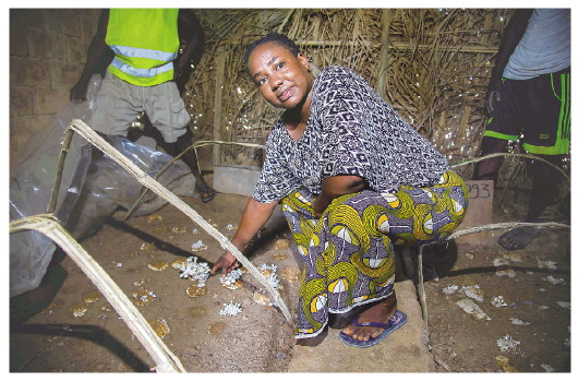 在中非共和國(guó)首都班吉附近的大馬拉地區(qū),盛夏7月的午后時(shí)分,太陽熱辣,一間約6平方米、四壁用棕櫚葉遮陰的菇棚里卻幽暗清涼。棚內(nèi)有兩個(gè)長(zhǎng)2米、寬1米的畦床,其間星羅棋布地點(diǎn)綴著剛萌出的數(shù)十簇平菇。40歲的法蒂瑪蹲在土埂上,用手撥弄著飽滿的灰白色菌蓋,臉上難掩豐收的喜悅。
