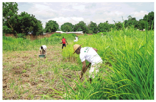 6月1日,在中非共和國(guó)首都班吉郊區(qū),當(dāng)?shù)孛癖姺N植菌草。新華社記者羅毓攝