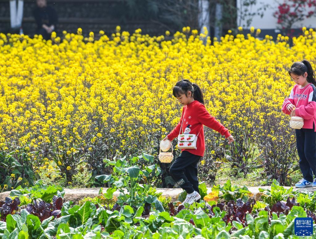 3月5日,在四川省崇州市道明鎮(zhèn),小朋友在油菜花田中玩耍。記者 王曦 攝