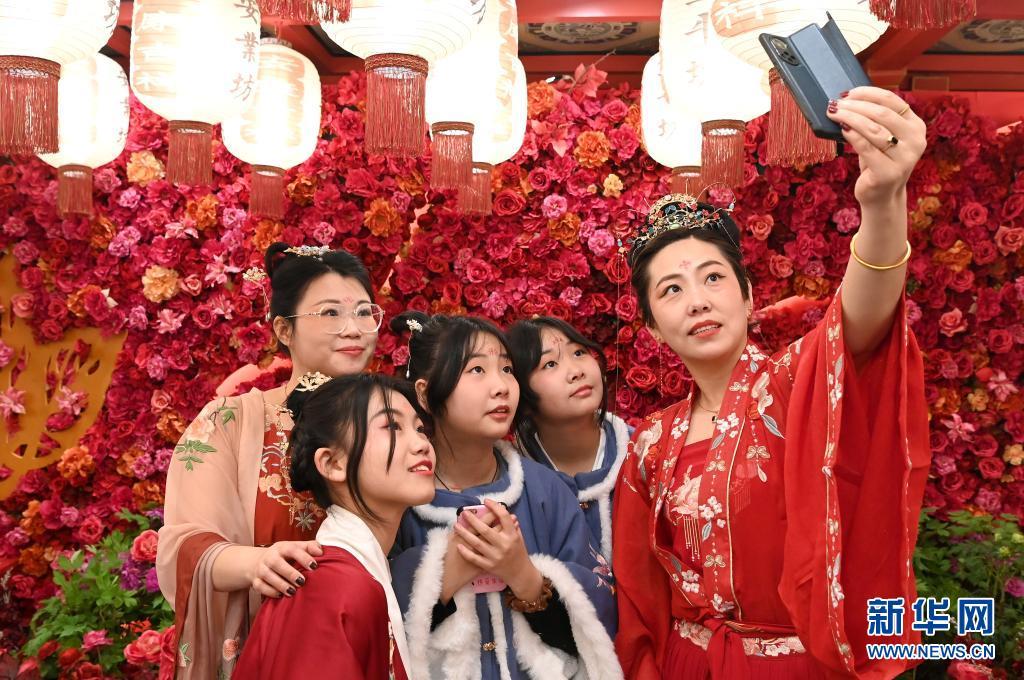游客身著漢服在西安“長安十二時辰”沉浸式唐風(fēng)市井生活街區(qū)內(nèi)留影。新華社記者 劉瀟 攝