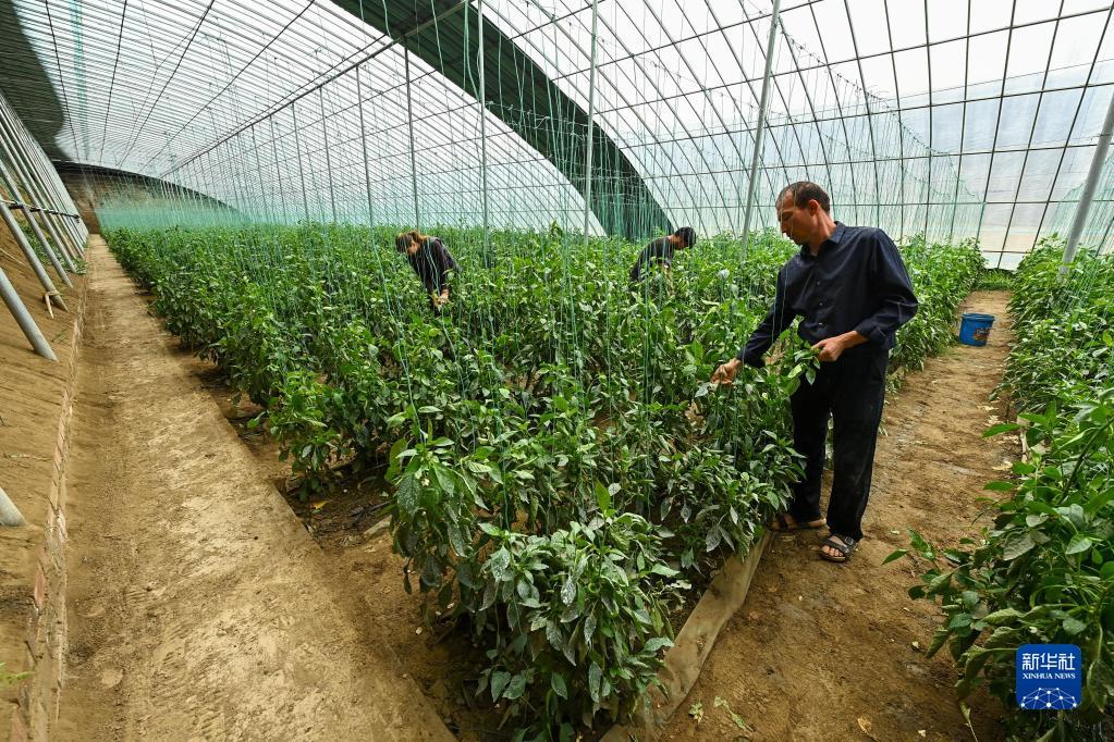 農民在現(xiàn)代設施農業(yè)示范基地物聯(lián)網(wǎng)日光溫室大棚為種植的辣椒整枝。記者 丁磊 攝