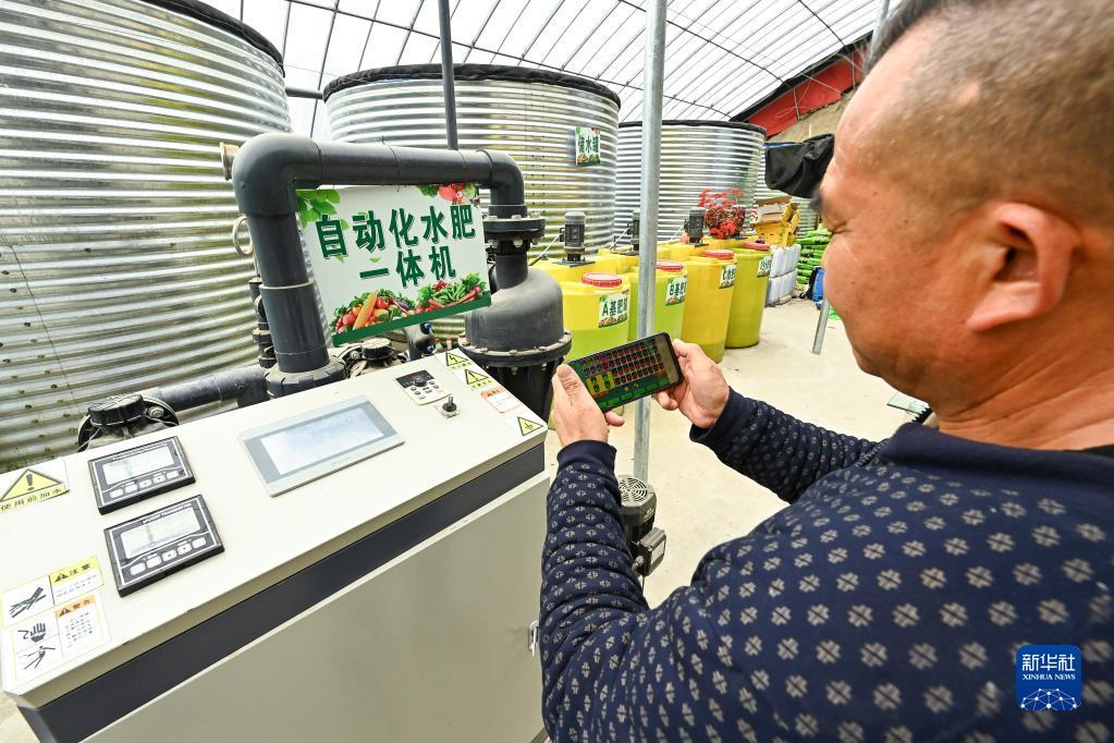 現(xiàn)代設施農業(yè)示范基地的管理人員通過手機控制自動化水肥一體機。記者 丁磊 攝