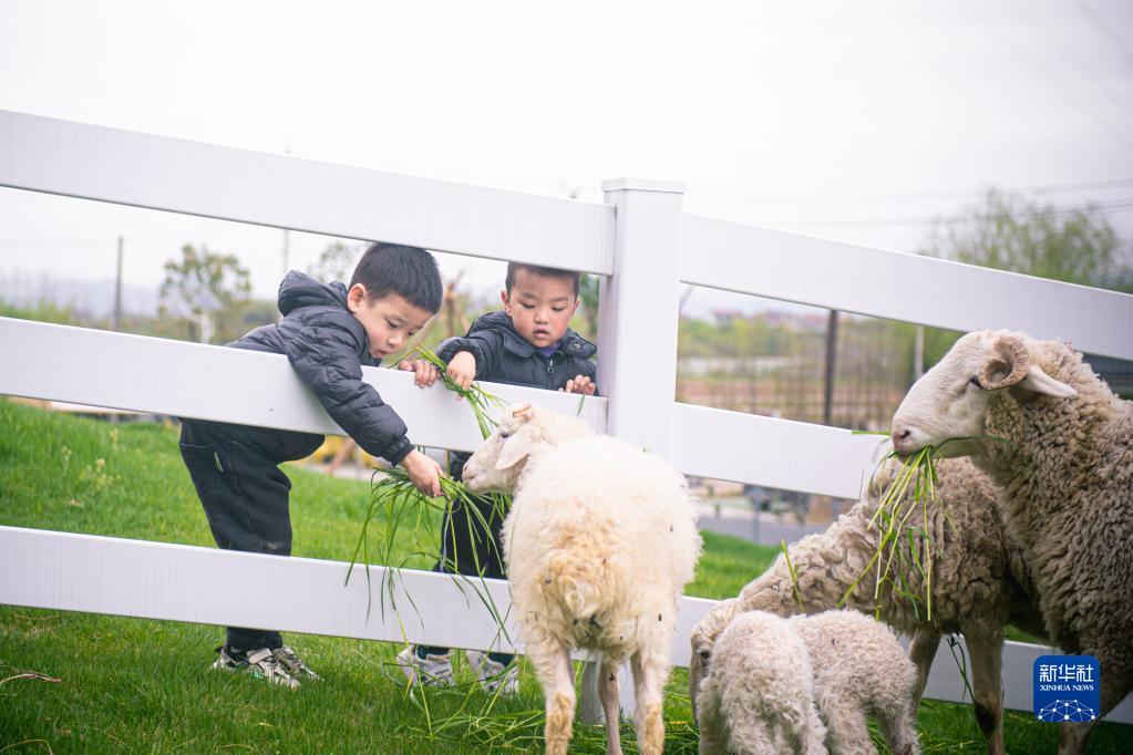 3月29日,小游客在諸暨市楓橋鎮(zhèn)杜黃新村的農(nóng)耕體驗研學基地喂羊。記者 江漢 攝