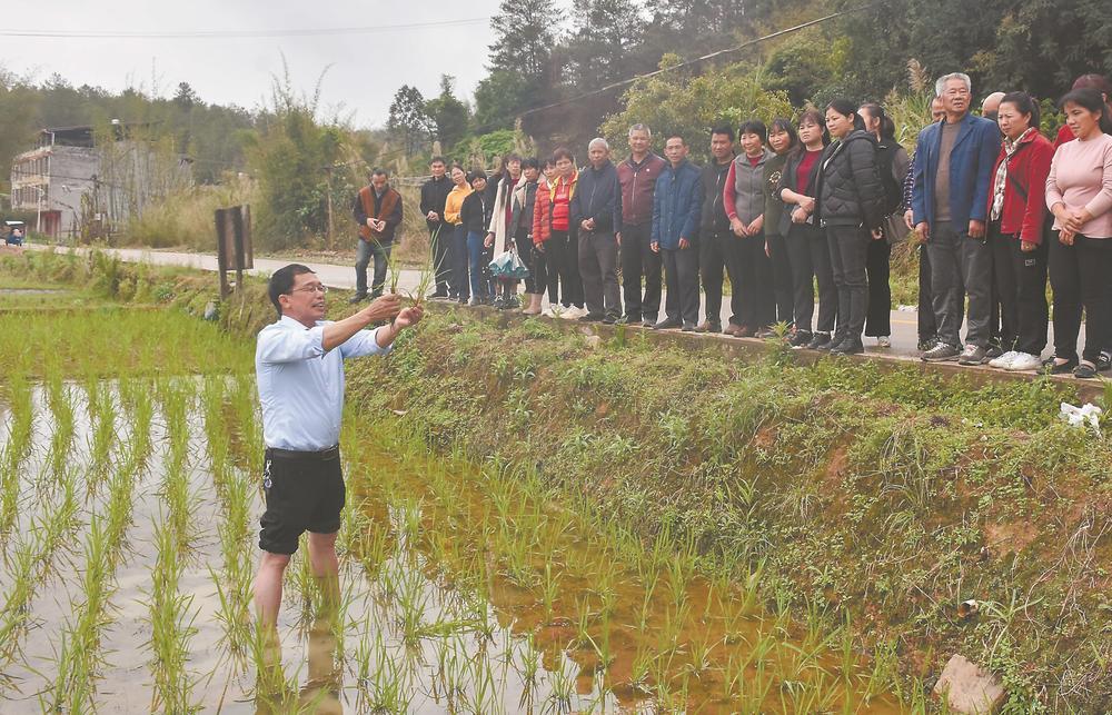 永定區(qū)2023年第七期高素質(zhì)農(nóng)民培訓班上,專家在田里講授早稻病蟲害防治知識。