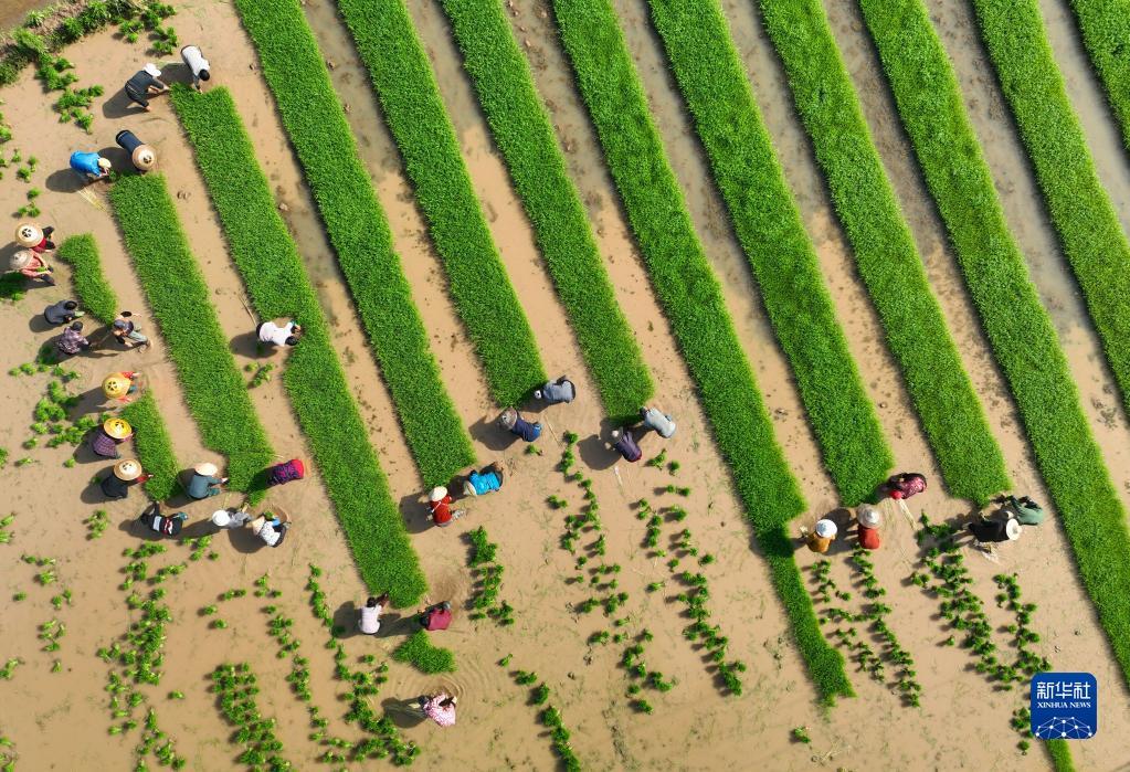 4月16日,湖南省衡陽市祁東縣金橋鎮(zhèn)村民在扯秧(無人機照片)。曹正平 攝