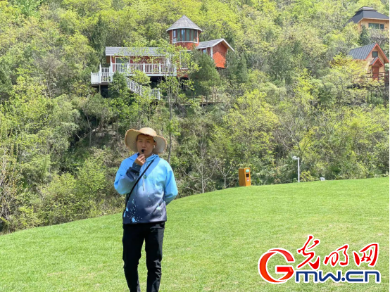 京山農(nóng)場管家梁棟毓向游客講解“森林樹屋”。李汶鍵 攝