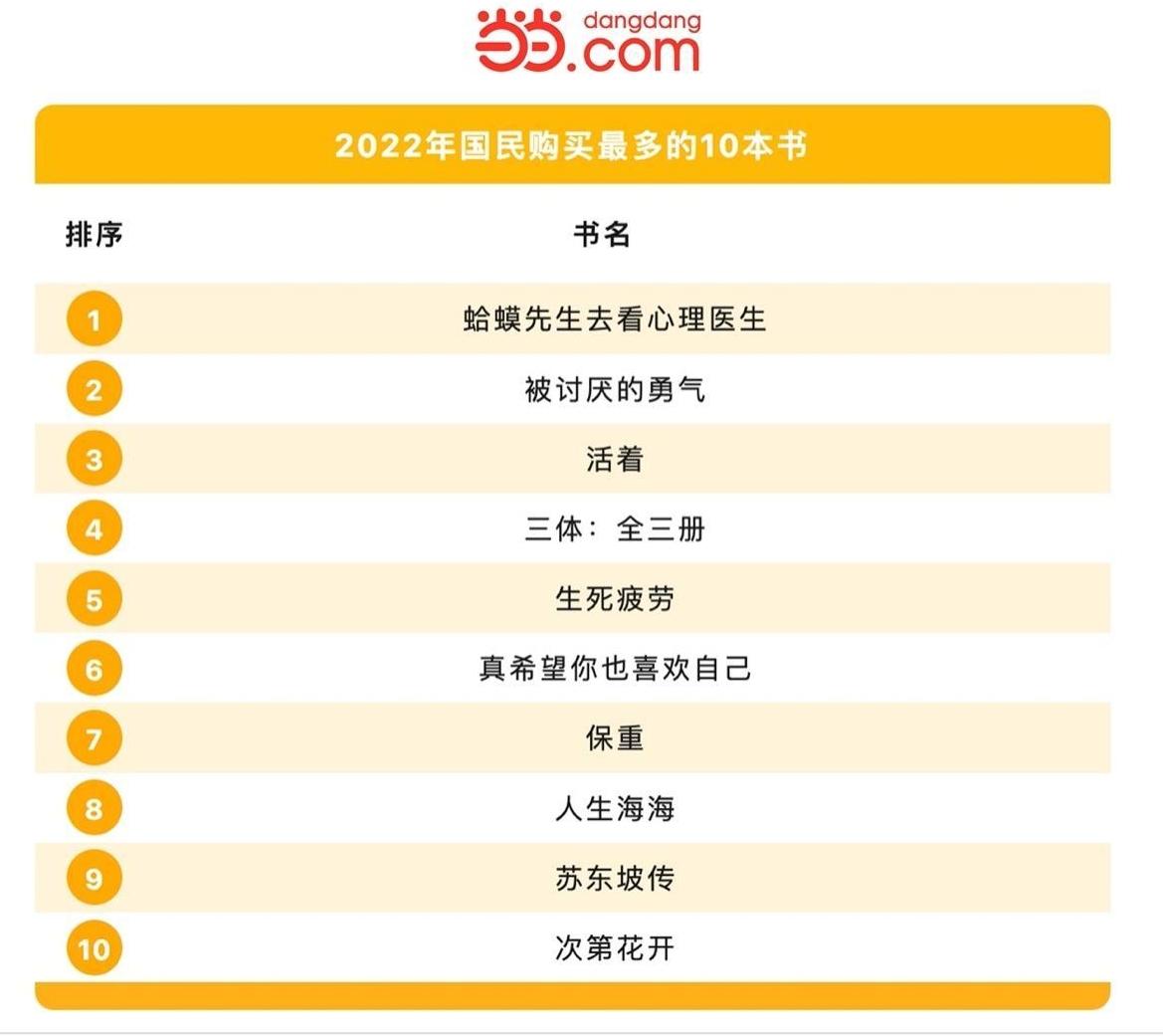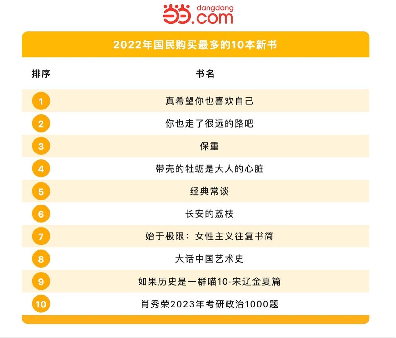 2022年國(guó)民購(gòu)買最多的10本書中,心理學(xué)、療愈類、成功勵(lì)志、嚴(yán)肅文學(xué)、科幻書籍霸榜。邊躺邊卷是年度閱讀主題,一方面讀者通過自助心理類,心靈療愈類、嚴(yán)肅文學(xué)類書籍對(duì)抗精神內(nèi)耗,尋求自洽;一方面又通過成功勵(lì)志類、科幻類等書籍尋求積極、振奮的心態(tài)。