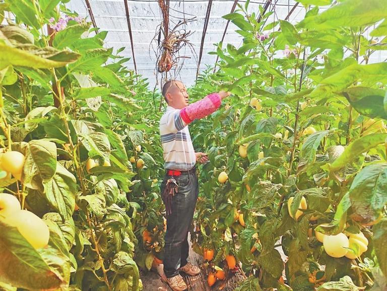 周明亮查看人參果長(zhǎng)勢(shì)。記者 于曉明 攝