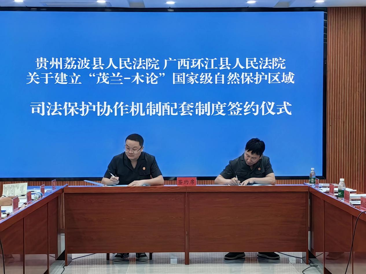 2022年10月,貴州省荔波縣人民法院、廣西環(huán)江毛南族自治縣人民法院在茂蘭法庭共同簽署了《茂蘭-木論國家級自然保護區(qū)跨區(qū)域司法保護協(xié)作機制框架協(xié)議》,拉開了黔桂兩省區(qū)生態(tài)保護跨區(qū)域司法保護協(xié)作的序幕。
