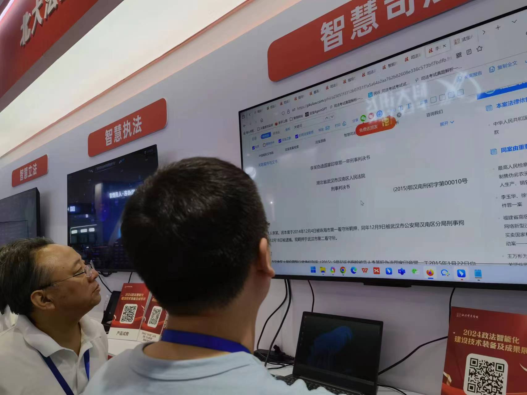 7月10日,記者在北京國(guó)家會(huì)議中心參觀由法制日?qǐng)?bào)社主辦的“2024政法智能化建設(shè)技術(shù)裝備及成果展”(以下簡(jiǎn)稱(chēng)“政法裝備展”)時(shí),看到了法律大模型給司法工作帶來(lái)高效便捷新賦能的各類(lèi)演示場(chǎng)景。