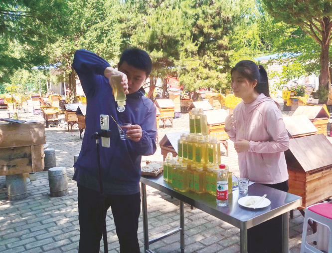 普社村第一場(chǎng)直播開(kāi)始時(shí),大山深處的大片洋槐花已開(kāi)到了尾聲。景嘉麗和“90后”鎮(zhèn)紀(jì)檢干部劉勇一起站在鏡頭前,小蜜蜂在旁邊“嗡嗡嗡”地飛來(lái)飛去,鎮(zhèn)上干部圍站在鏡頭背后,很多村民也趕來(lái)看熱鬧。隨著直播間涌進(jìn)來(lái)的網(wǎng)友越來(lái)越多,提問(wèn)也越來(lái)越多,兩人逐漸放松:“家人們,我們背后的山上全是洋槐樹(shù),這里沒(méi)有污染,洋槐花蜜的品質(zhì)特別好。”首場(chǎng)直播,兩個(gè)小時(shí)賣(mài)出了300余單蜂蜜,價(jià)值2萬(wàn)多元。對(duì)于一個(gè)地處大山深處的小鄉(xiāng)村而言,這個(gè)成績(jī)讓所有人喜出望外,也堅(jiān)定了高崖鎮(zhèn)繼續(xù)通過(guò)網(wǎng)絡(luò)直播幫助群眾銷(xiāo)售農(nóng)產(chǎn)品的信心,如今助農(nóng)直播成為該鎮(zhèn)常態(tài)化工作之一。