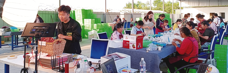 網(wǎng)絡(luò)主播在金臺(tái)區(qū)櫻桃分揀打包現(xiàn)場(chǎng)進(jìn)行直播帶貨