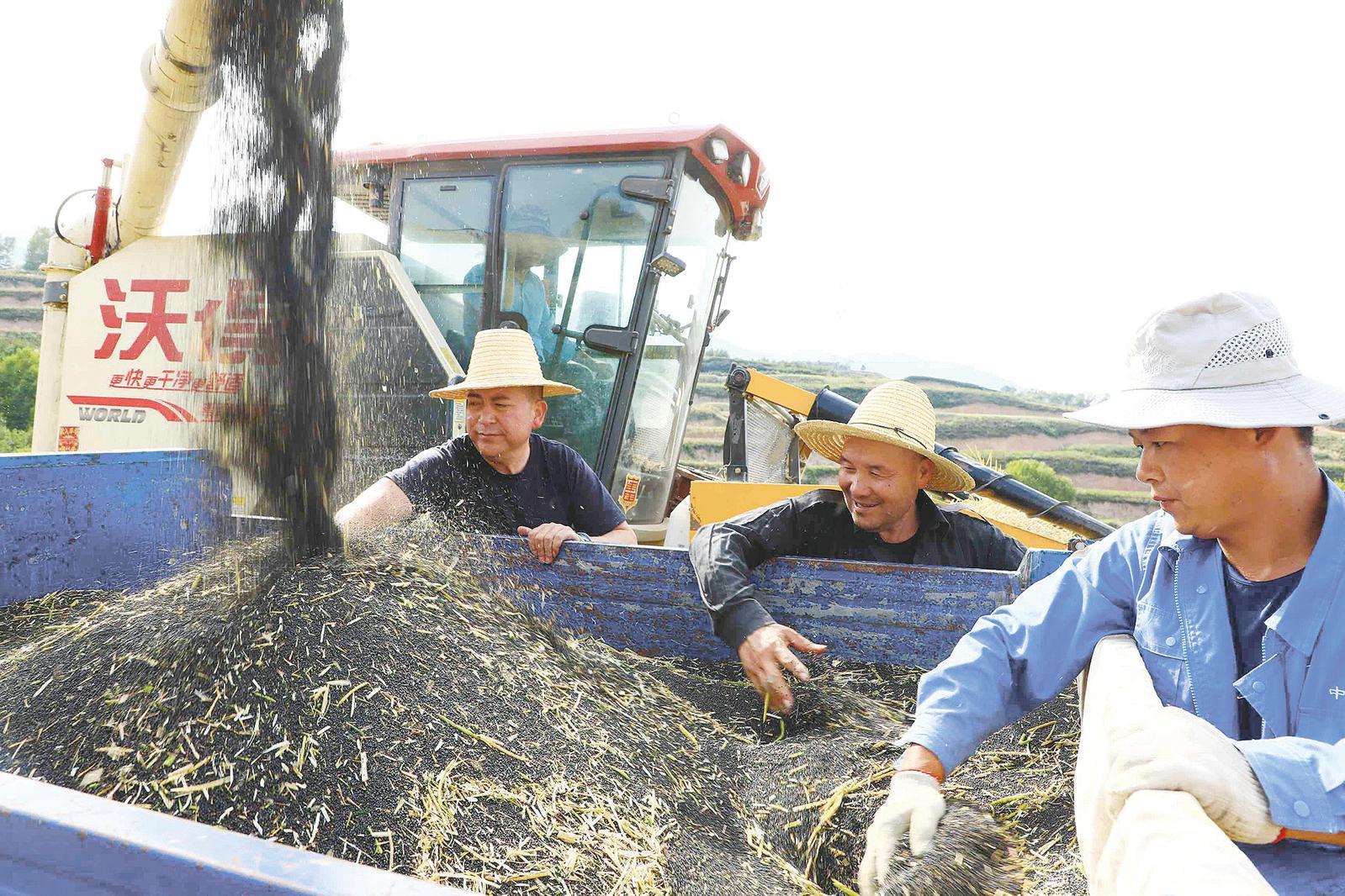 在一處坡洼的田塊里,一臺(tái)聯(lián)合收割機(jī)正在卸糧,收獲的油菜籽從卸糧口傾瀉而下,倒入三輪車斗里?!斑@塊田以前是撂荒地,我們合作社流轉(zhuǎn)后種植了油菜。今年雨水好,看莊稼長(zhǎng)勢(shì),油菜籽畝均產(chǎn)量至少在150公斤以上。”張家莊村黨支部書記張斌先和村支部委員寧智祥捧起一把黑黝黝的油菜籽,臉上露出收獲的喜悅。