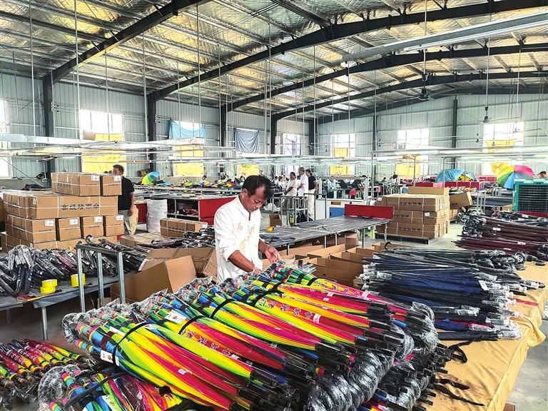 2021年6月至2023年12月,該鎮(zhèn)以點(diǎn)帶面、擴(kuò)大規(guī)模、提升產(chǎn)能,以管理區(qū)為單位建立規(guī)模廠,以村為單位建立加工工坊,以家庭為單位建立加工戶,把適合家庭生產(chǎn)的加工環(huán)節(jié)更多地延伸到農(nóng)戶家中,推動(dòng)產(chǎn)業(yè)規(guī)??焖贁U(kuò)大。目前,全鎮(zhèn)利用村閑置村部、學(xué)校、廠房、民宅等建成規(guī)模廠11家、制傘工坊20個(gè)、加工戶1000多戶,培育4個(gè)自主品牌,幾十個(gè)品種,上百款樣式,年產(chǎn)雨傘2000萬把、傘架4000萬支,年產(chǎn)值5億多元,帶動(dòng)就業(yè)2000余人。真正把產(chǎn)業(yè)鏈實(shí)體留在縣域,將更多就業(yè)崗位留在鄉(xiāng)村,帶動(dòng)群眾在家門口就近就便就業(yè)、就地城鎮(zhèn)化,養(yǎng)老帶小、上班掙錢、農(nóng)忙種地“三不誤”。