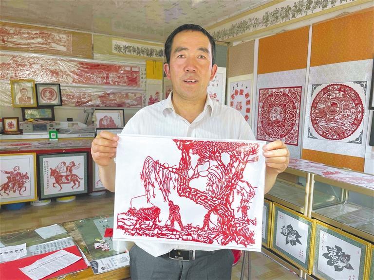 剪紙藝人楊國(guó)權(quán)展示作品《農(nóng)耕圖》