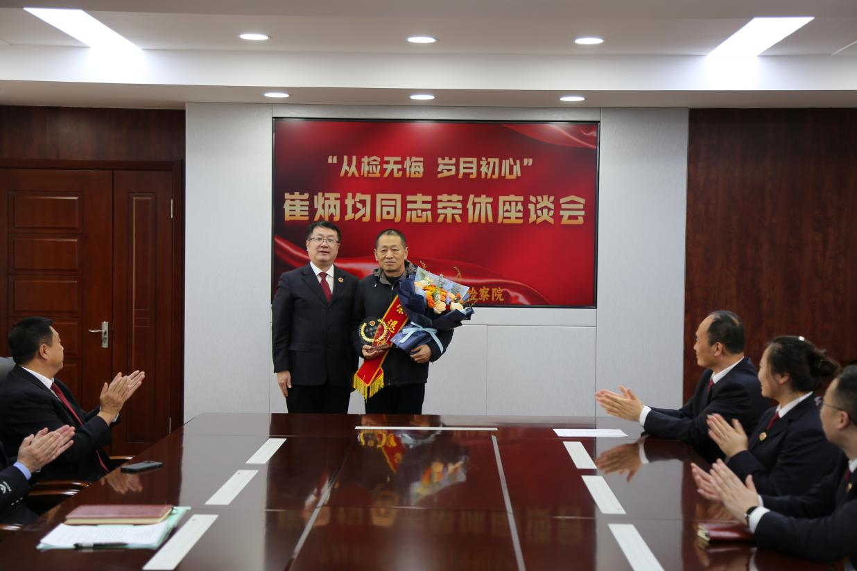 儀式上,院黨組書記、檢察長王曉輝為崔炳均同志佩戴“光榮退休”紅色綬帶、贈送鮮花,頒發(fā)光榮退休紀念品,并代表院黨組和全體干警致以敬意與祝福,感謝其多年來為檢察事業(yè)的辛勤與付出。