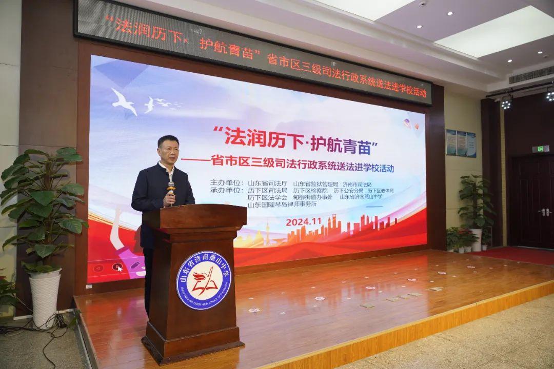 為貫徹落實(shí)山東省未成年人違法犯罪綜合治理工作座談會(huì)精神,切實(shí)發(fā)揮普法工作在未成年違法犯罪中的源頭預(yù)防作用,11月11日,省市區(qū)三級(jí)司法行政系統(tǒng)組織開(kāi)展的“法潤(rùn)歷下·護(hù)航青苗”送法進(jìn)學(xué)?;顒?dòng)在燕山中學(xué)正式啟動(dòng)。山東省司法廳黨委委員、副廳長(zhǎng),省監(jiān)獄局黨委書(shū)記、局長(zhǎng)王發(fā)軍出席活動(dòng)。