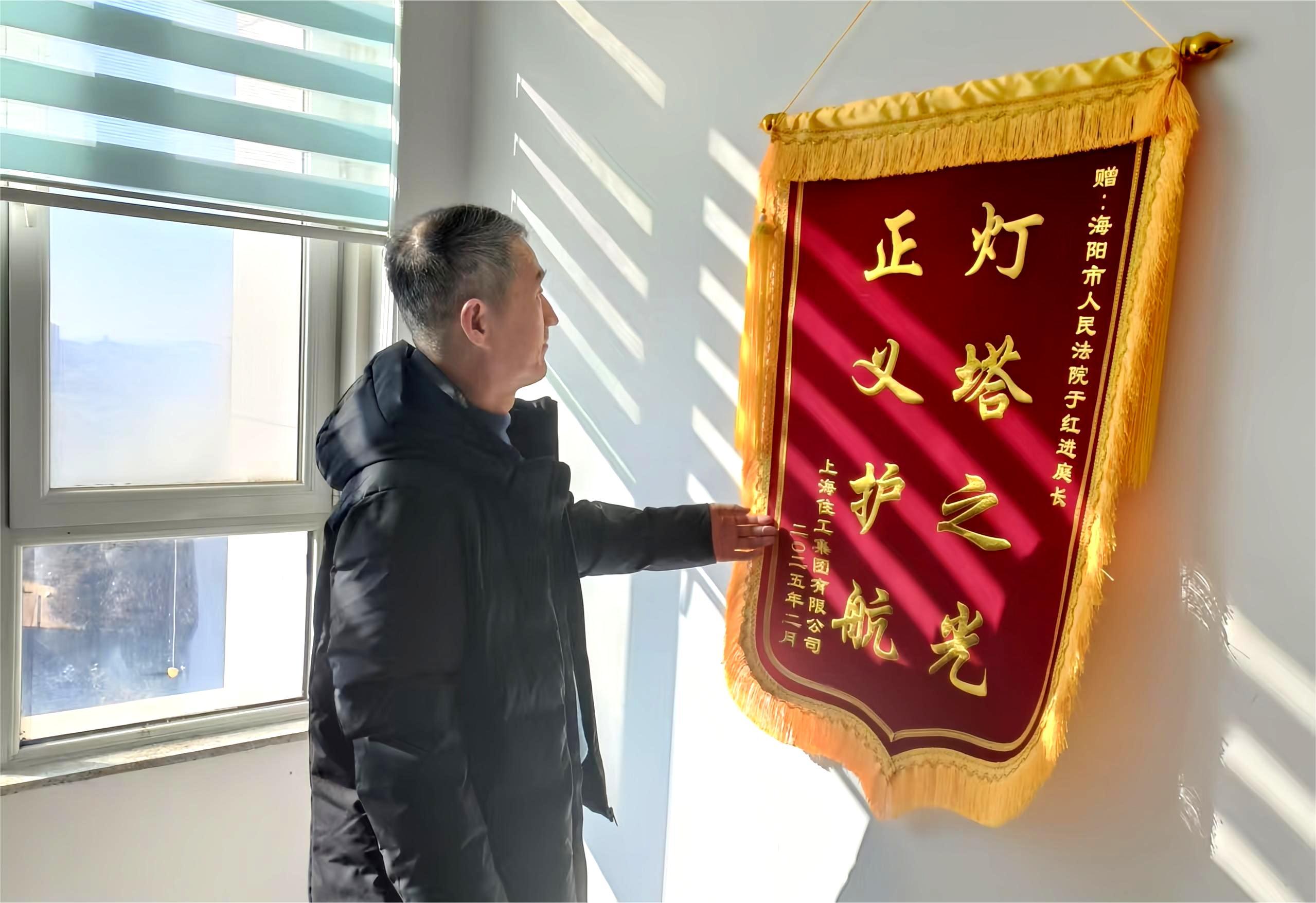 2月12日是正月十五元宵節(jié),上午10時,陽光很暖,正正地灑落在山東省海陽市人民法院民一庭辦公室的那面錦旗上,庭長于洪進(jìn)合上卷宗,看著剛剛郵寄來寫有“燈塔之光 正義護(hù)航”字樣的錦旗,思緒也跟著回到了年前的臘月二十七。