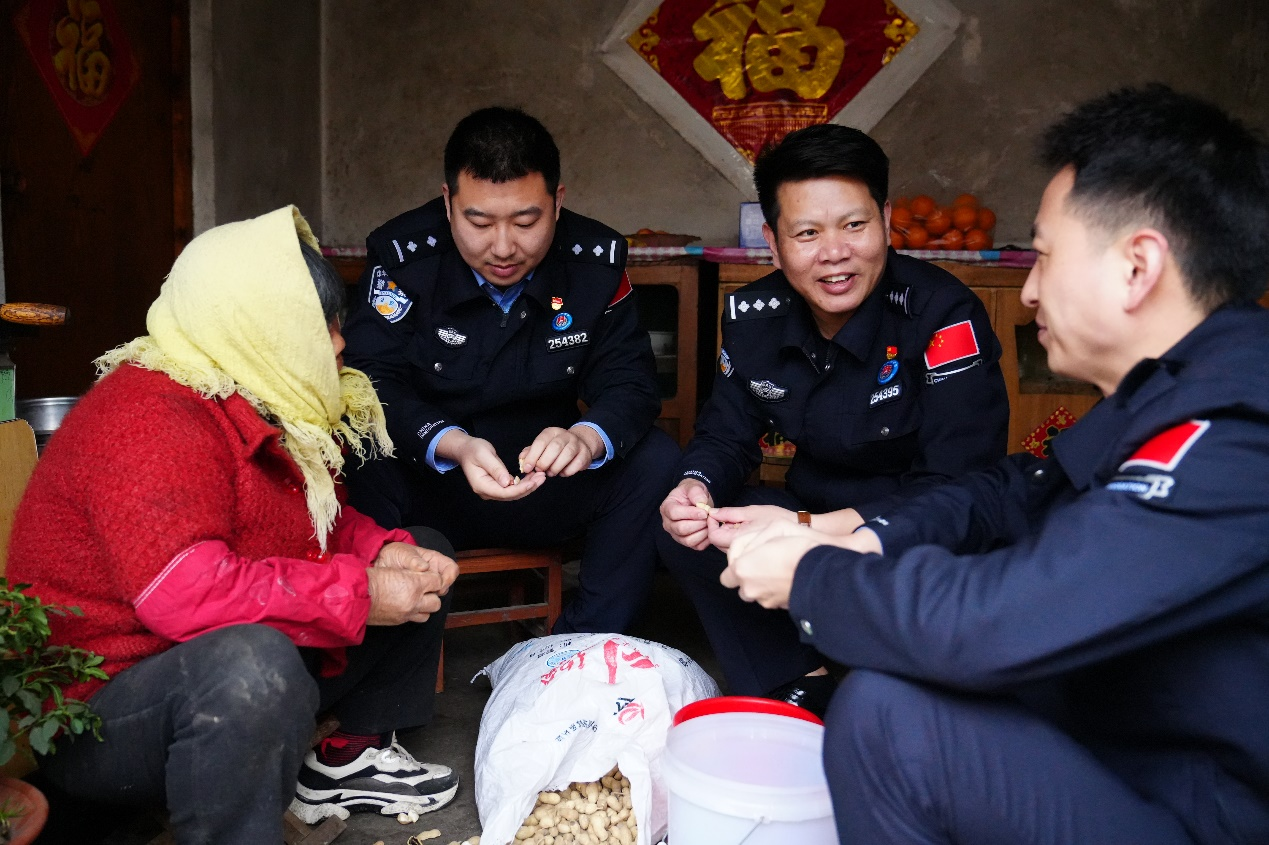 據(jù)了解,董翠蓮老人患有眼疾,孤身照顧身有殘疾的老伴已有20余年。當(dāng)民警楊曉龍、胡云龍、李虎一行走進(jìn)董翠蓮老人家中時(shí),老人正在屋里剝花生。“大娘,我們來幫您!”民警們立即放下手中的慰問品,圍坐在老人身邊剝起花生來。“剛下完雨,風(fēng)大,您年齡大了出門不安全,有什么需要給我們打電話。”“最近用電、用氣一定要注意安全!”……句句關(guān)懷、聲聲叮嚀讓老人感動(dòng)不已。盡管雨后的天空陰沉沉的,但警民嘮嗑的笑聲在小院里此起彼伏。“這些孩子比親兒子還貼心,經(jīng)常來看我和我老伴,這次又送來這么多東西?!倍渖徖窬氖植蛔】滟?。