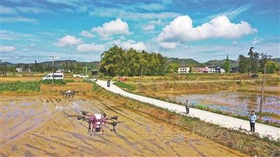 星橋鎮(zhèn)新農(nóng)人操作無人機(jī)開展水稻播種社會(huì)化服務(wù)。劉輝 攝