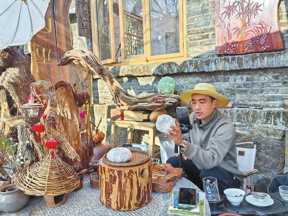 大乖來自陜西西安,是旅游愛好者。2022年,他通過網(wǎng)友介紹來到白云村,被這里“遠(yuǎn)上寒山石徑斜,白云生處有人家”的詩意景致吸引,便決定旅居于此。“這里不僅風(fēng)景如畫,還有茶葉、核桃、蜂蜜等土特產(chǎn)。我是主播,既然住下來,就想幫村民通過直播增收?!贝蠊缘南敕ǖ玫酱濉皟晌钡闹С帧Kc團(tuán)隊(duì)一起修繕村內(nèi)的“禪茶小院”,用于短視頻拍攝,又把老電站舊址改造成簡(jiǎn)易直播間,讓古樸的村莊刮起一場(chǎng)“電商風(fēng)暴”。