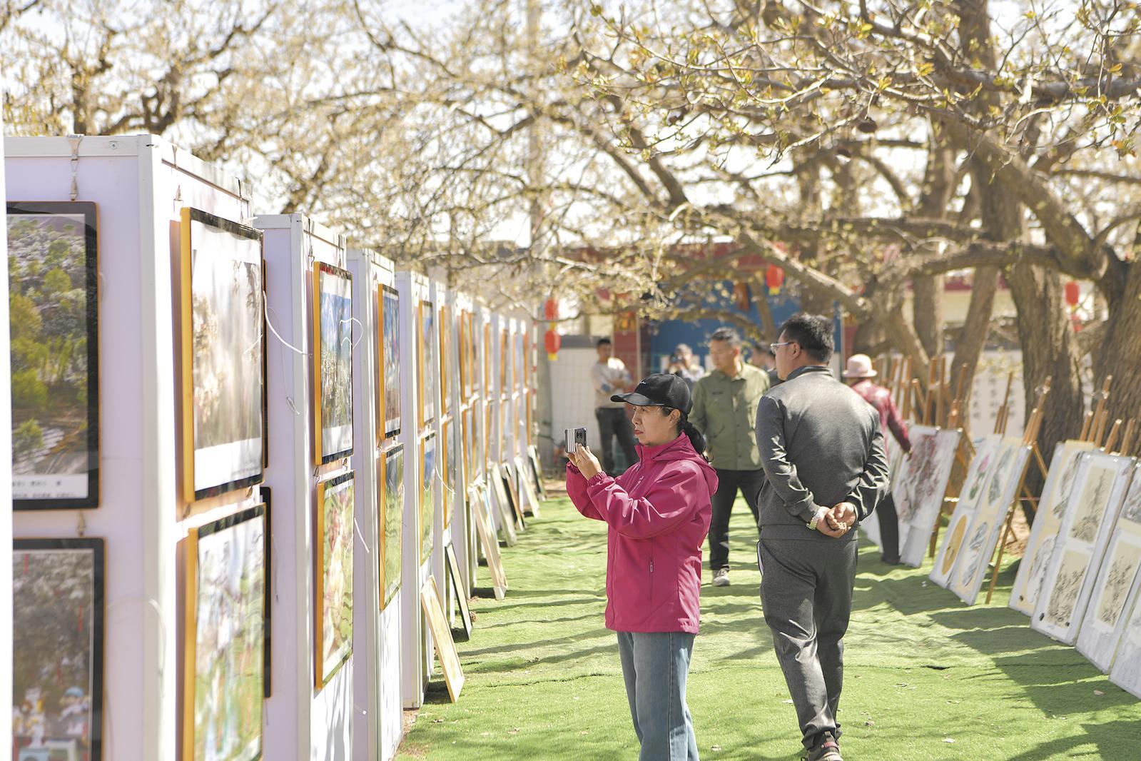 今年的橋頭村很不一樣,不僅增設(shè)了停車場,多了很多“新”攤位,進入梨園的道路兩旁還增加了“哪吒鬧春”國潮打卡彩繪墻。游客一路賞梨花、拍照,就來到了梨園。精心裝扮后的梨樹古色古香,樹下設(shè)置了賞花品茗休憩點,坐滿了欣賞表演的游客,還有“梨園春色”主題攝影藝術(shù)展,供游客賞梨花之美、品人文之韻。