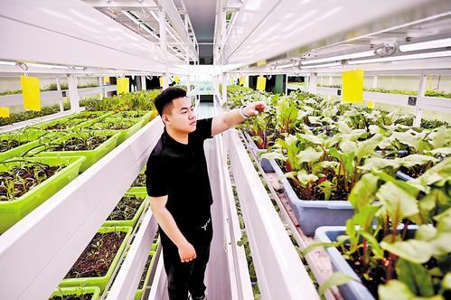 4月30日,冀州現(xiàn)代農(nóng)業(yè)融合創(chuàng)新基地植物工廠,農(nóng)技員在查看蔬菜長勢。
