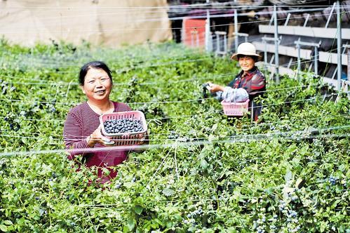 4月30日,北京新發(fā)地助力鄉(xiāng)村振興(冀州)示范園區(qū),工人高興地展示剛采收的藍莓。