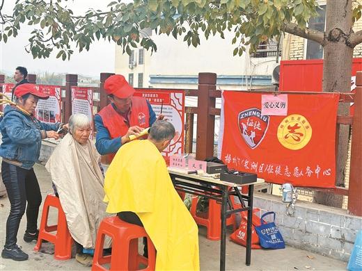 興龍街道平浪村志愿者服務(wù)隊(duì)在老區(qū)廣場(chǎng)開(kāi)展愛(ài)心義剪。(長(zhǎng)洲區(qū)融媒體中心供圖)
