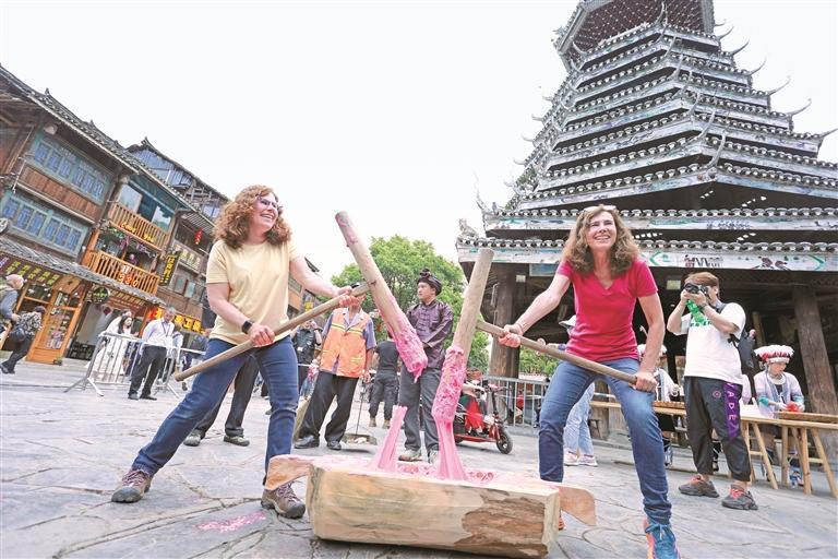 外國(guó)朋友體驗(yàn)打糍粑。吳光輝 攝