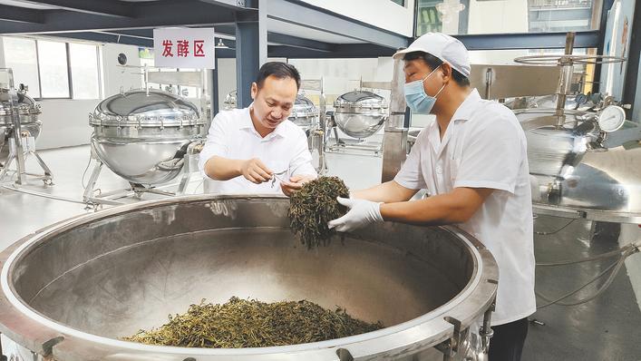 6月22日,湖北省十堰市鄖西縣澗池鄉(xiāng)下營村,湖北七夕茶業(yè)生物科技有限公司生產(chǎn)車間。烘干機的高溫慢慢蒸發(fā)掉茶葉的水分,車間里茶香氤氳。